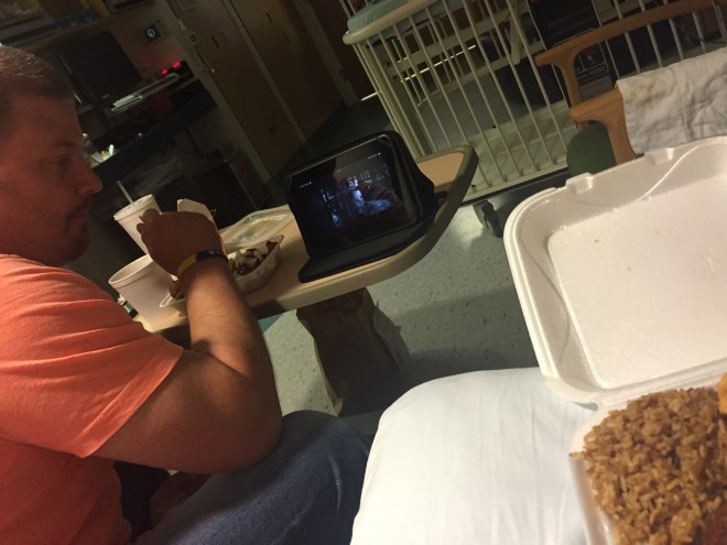 We had about all we could have of the hospital cafeteria so we ordered to delivery. We had a great dinner and a movie. 10 minutes in we turned the movie off cause it was hard to understand on a 5 inch screen. We will finish it when we get home on our 55 inch screen!!!