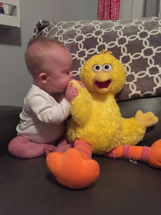 Watch out she will be eating steaks before we know it. Or maybe she likes chicken better? Big Bird looks really scared!