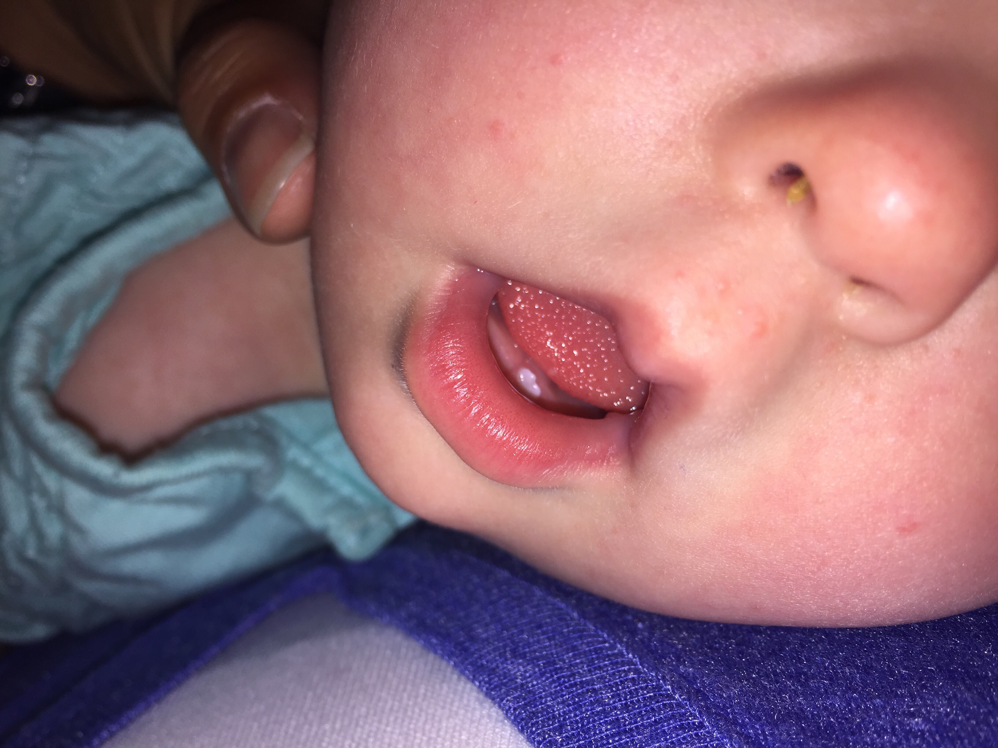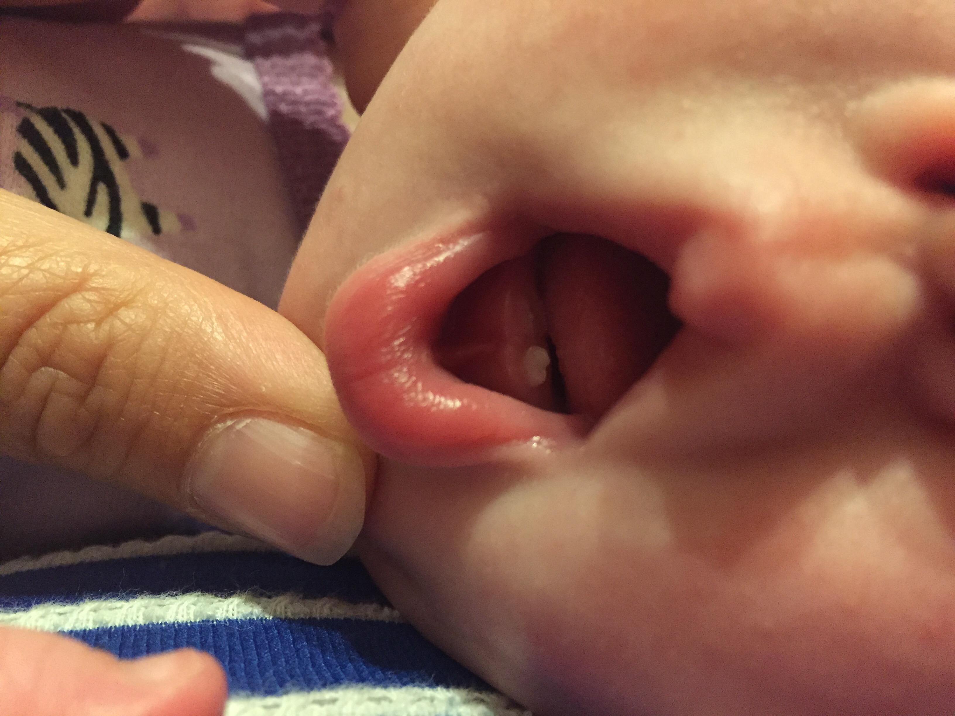 Jeremy first noticed it first when she put his fingers in her mouth. She never really was fussy over it coming in. Tough little girl!